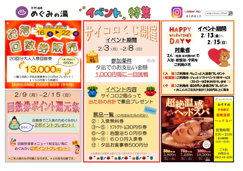 皆さま、お待たせいたしました! 「めぐみの湯」2月のイベントカレンダーが完成しました。