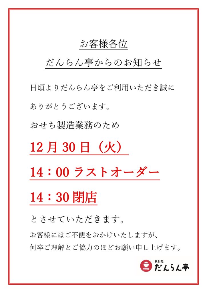 2025年12月24日「だんらん亭より」12/30(月) 閉店時間変更(繰り上げ)のお知…